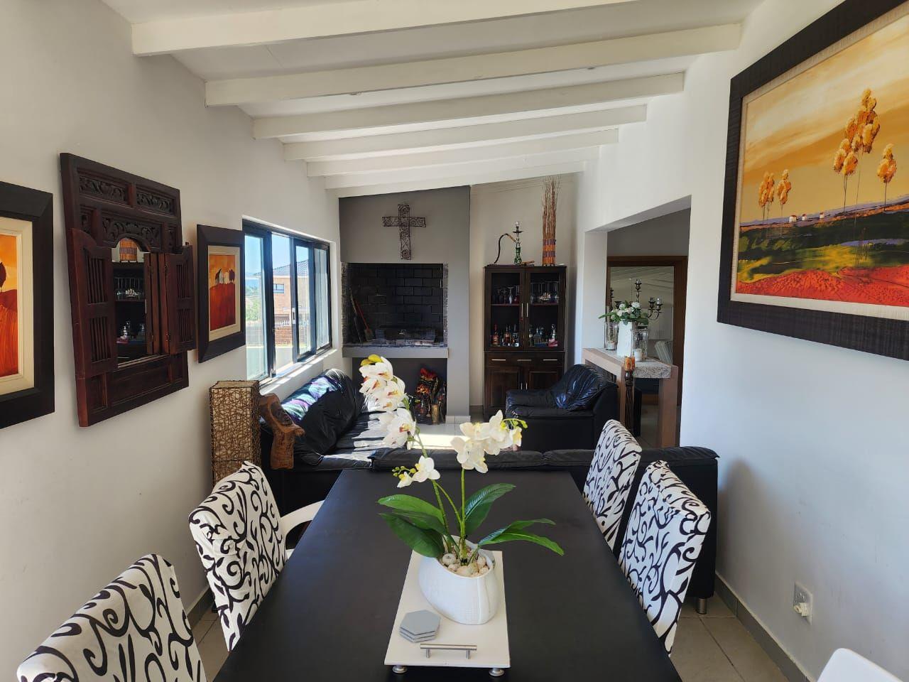 The heart of the home features an expansive open-plan layout that includes a welcoming lounge, a refined dining area, and a dedicated braai room tailor-made for entertaining. The modern kitchen is a chef’s delight, complete with a custom island, generous cupboard space, a gas hob, and dual eye-level ovens. A separate scullery accommodates a top-loader washing machine, dishwasher, and large tumble dryer, ensuring convenience without compromising on style.