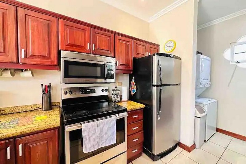 The master has a king sized bed, along with a lot of other furniture, with room to spare, and the shower in the master bath is very large. The guest bedrooms have a queen sized bed, and the other has two twin beds. The kitchen is near the entry of the home with granite countertops, stainless steel appliances including a dishwasher ( a rarity here), and the laundry area is at the back of the kitchen. There is also a half bath for guests, meaning no one has to traipse from the pool through a bedroom to get to a bathroom!