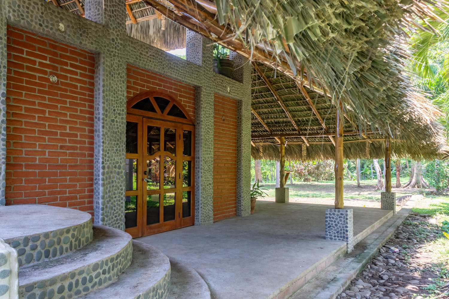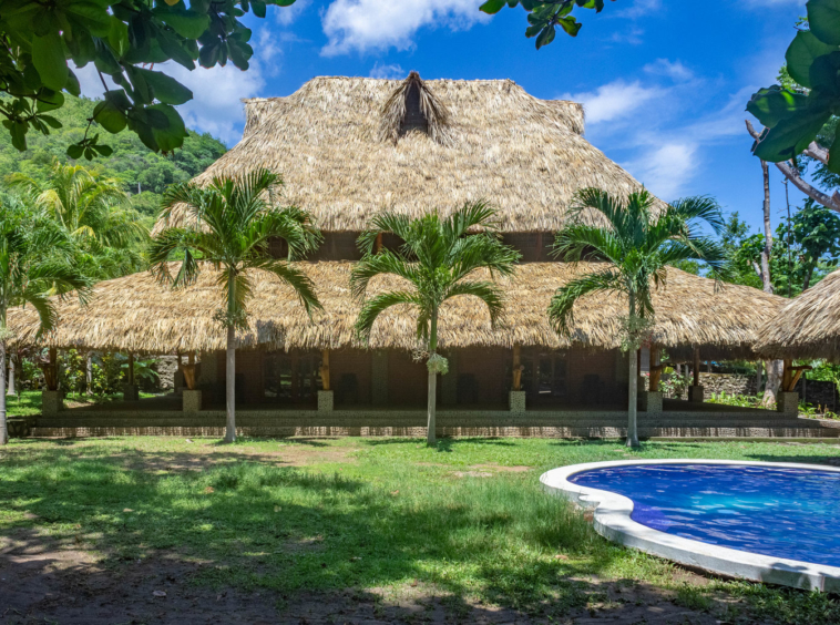 3 plots up from the point! Very well made home built right with concrete and brick with giant open palapa up on top with trim, furniture and big carvings built with local wood! Built by an American for retirement 5 yrs ago on almost an acre of many different fruit trees and other awesome landscaping with newer pool and detached bar n grill with outdoor bathroom n shower for after surf sesh.