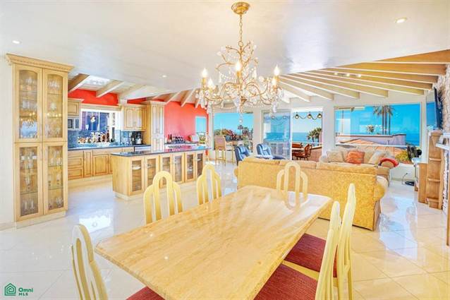 On the upper level is the master bedroom, and on the lower level are two additional bedrooms, each with en suite bathrooms. On the left, you will find an open layout housing the kitchen, a bar area, and the living room, all enjoying a 15-foot-high vaulted ceiling, and beautiful ocean views through the panoramic tinted windows. The dining room is spacious, with a chandelier, a mirror wall, and a dining table for six. The living room comes with a fireplace, an ornate brick wall, panor