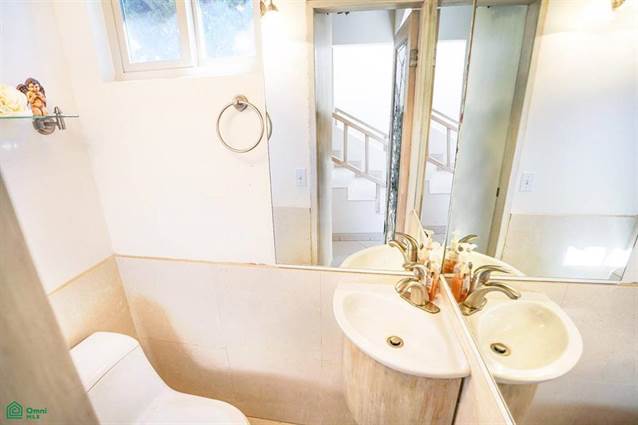 This home features a rare 2-level split layout and a rooftop terrace, and it comes fully furnished and with appliances included. The living room, dining area, and kitchen are on the ocean side and lie on the split level (ground level), while the bedrooms are in the back in the upper and lower levels. The ocean-view terrace is spacious, and it allows access to a rooftop terrace where you can enjoy the sun and amazing ocean views. There are two ways to enter this home, one is from the garage, which features space for one car, an electric garage door, and space for storage. The other way is through the main entrance that is located on the side, respective to the street, through a walkway and a green area which is also part of the property. Once inside, from the main entrance on your right, you will see the door that connects to the garage, a laundry area, and a small washroom behind it for guests. Further ahead you will see the staircase that splits the ground level.